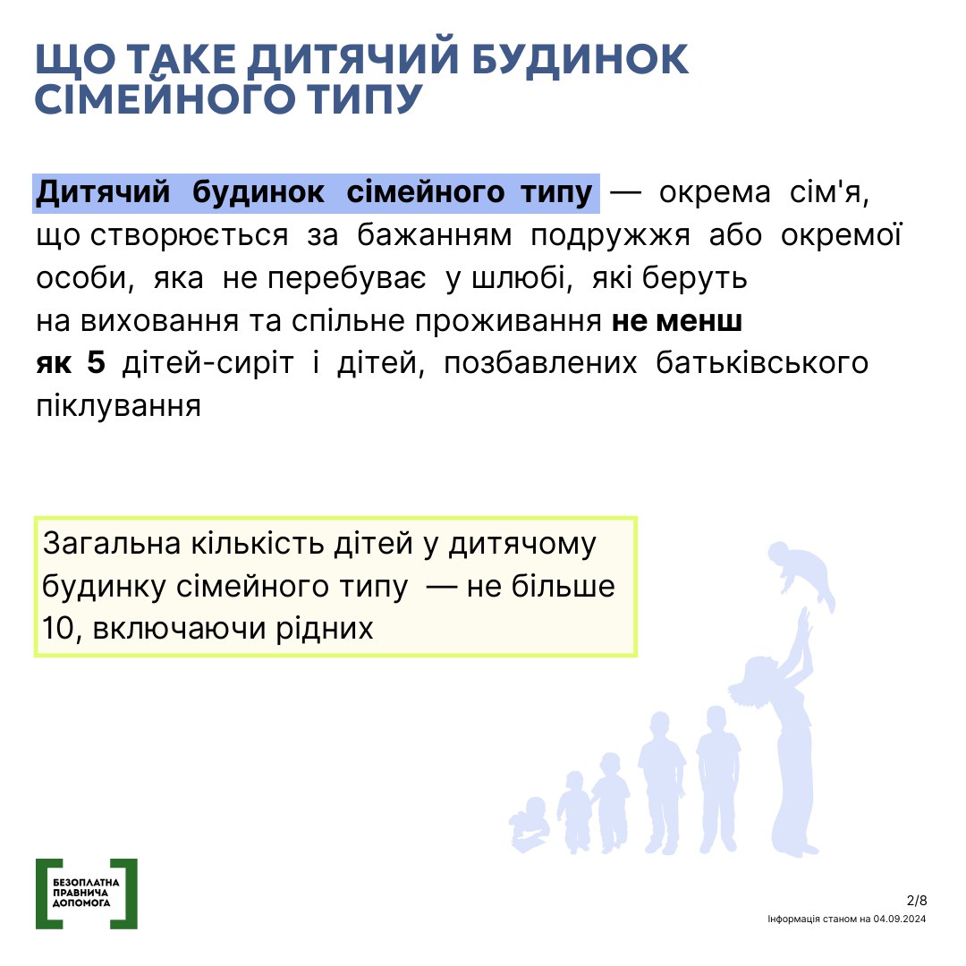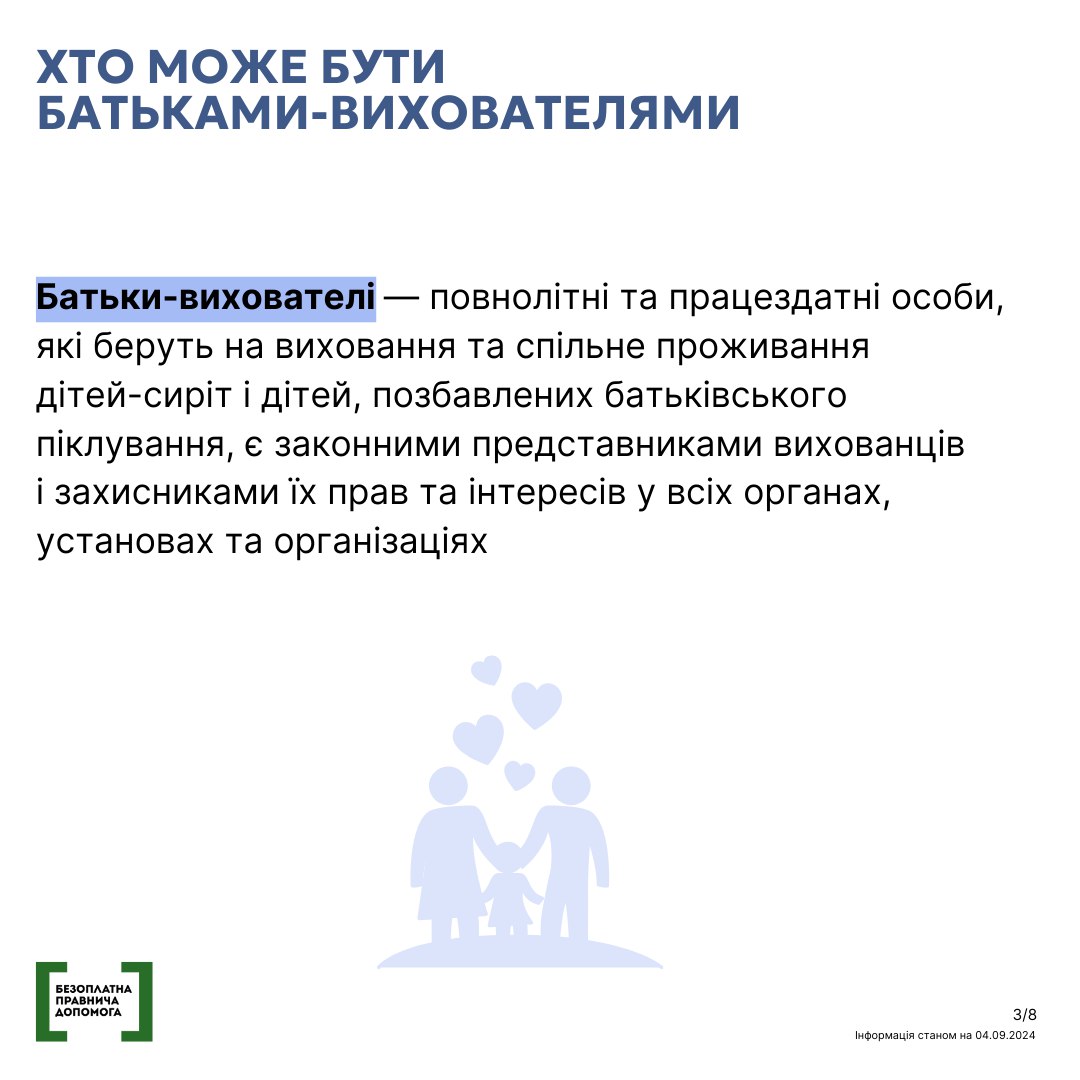 Батьки-вихователі дитячих будинків сімейного типу — повнолітні та працездатні особи, які беруть на виховання та спільне проживання дітей-сиріт і дітей, позбавлених батьківського піклування, є законними представниками вихованців і захисниками їх прав та інтересів у всіх органах, установах та організаціях.