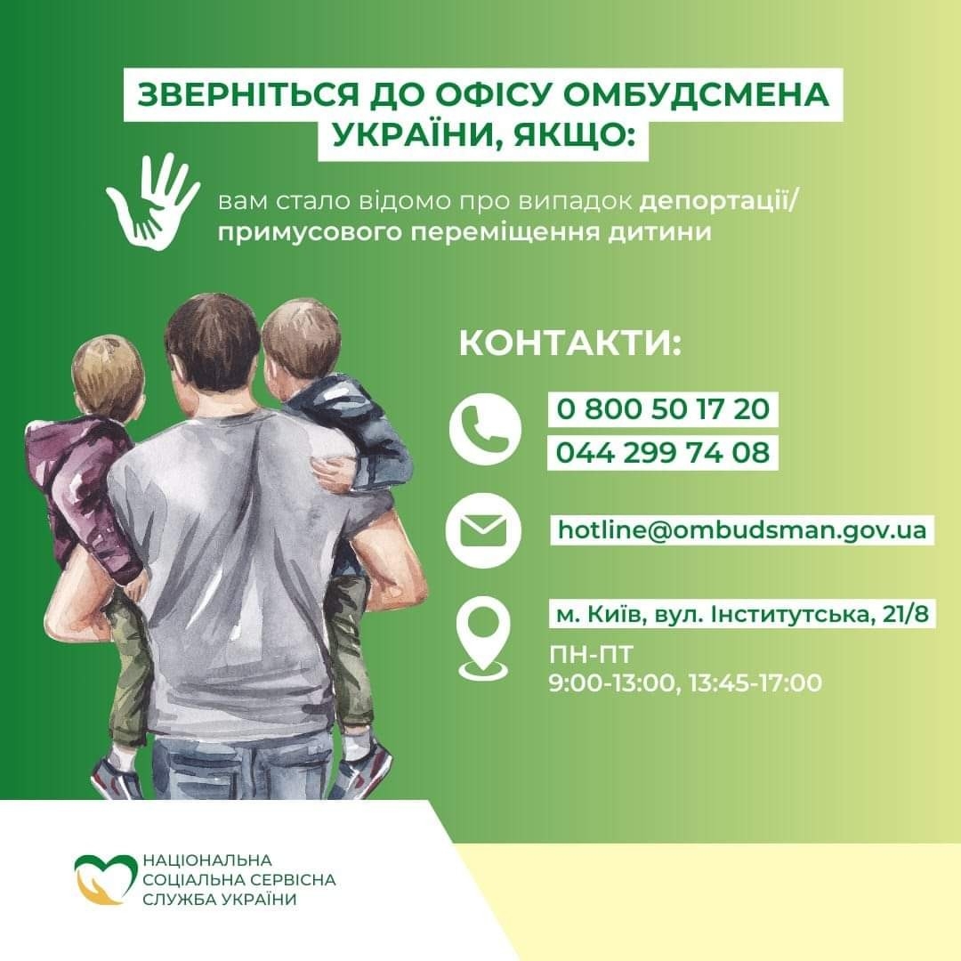 В інфографіці залишаємо для вас контактні дані, за якими ви можете звернутися у випадку, якщо отримаєте будь-яку інформацію про депортовану або примусово переміщену дитину.