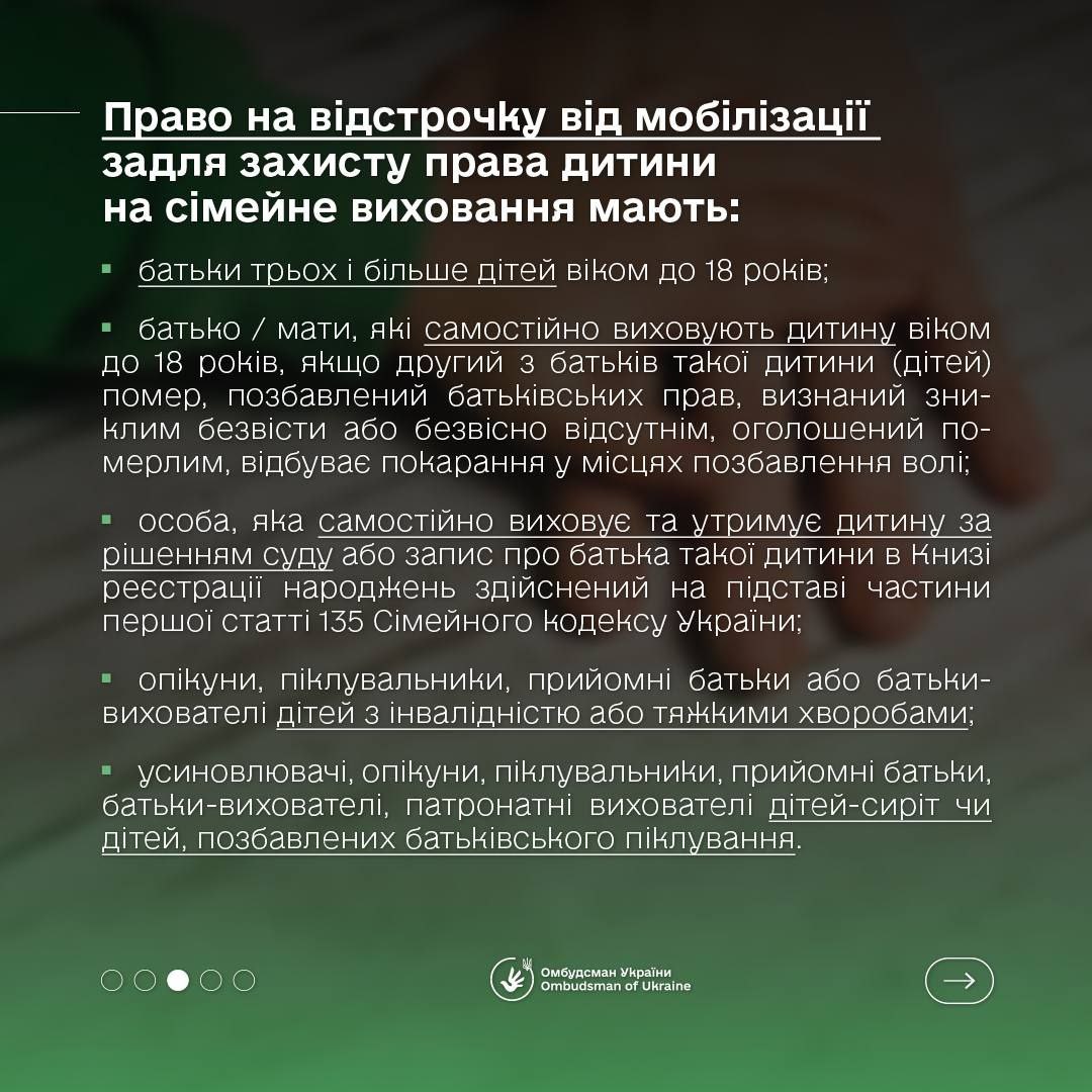 Ця інфографіка пояснює, які гарантії захисту права дитини на сімейне виховання передбачені законом та у яких випадках батьки можуть отримати відстрочку від мобілізації для збереження стабільного сімейного середовища.