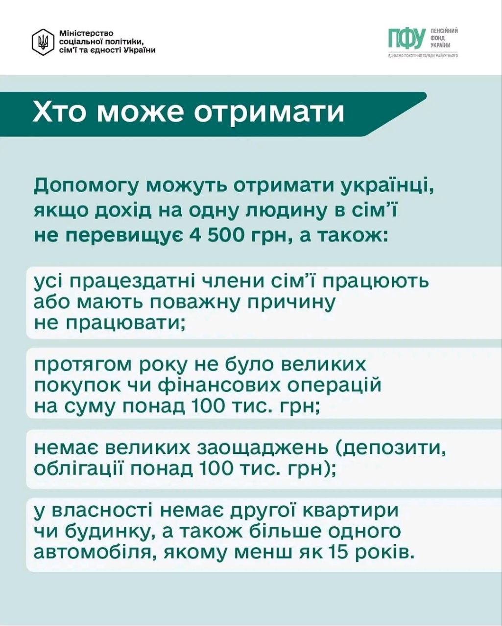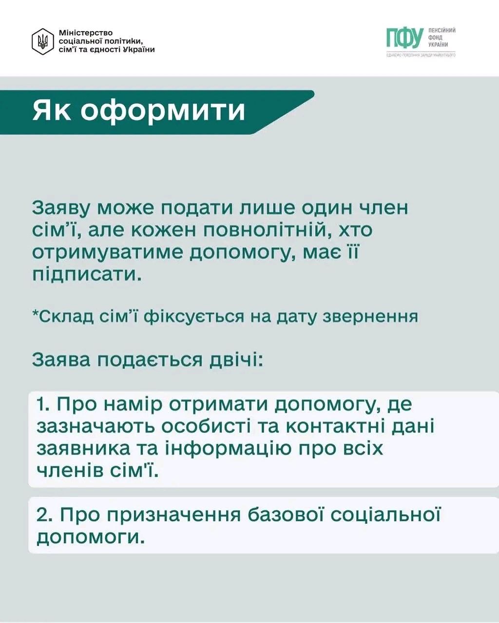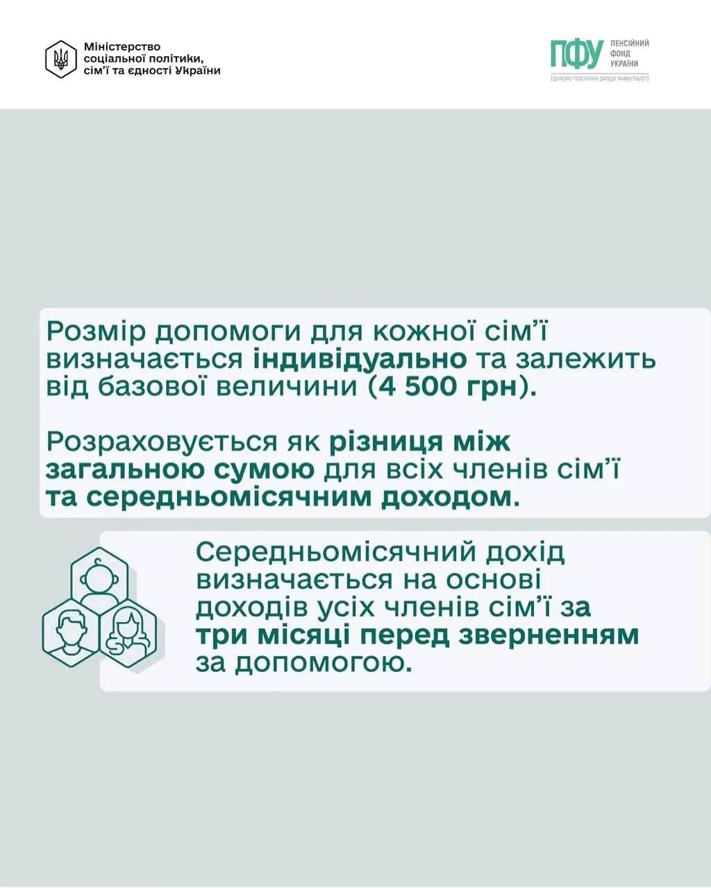 Така допомога — це щомісячна виплата, що об’єднує декілька видів державної допомоги для сімей у складних життєвих обставинах. Тобто замість кількох окремих виплат родина отримує одну — базову, розраховану на всю сім’ю. Виплата призначається на шість місяців, а далі автоматично може продовжуватися на весь час експериментального проєкту — 2 роки.