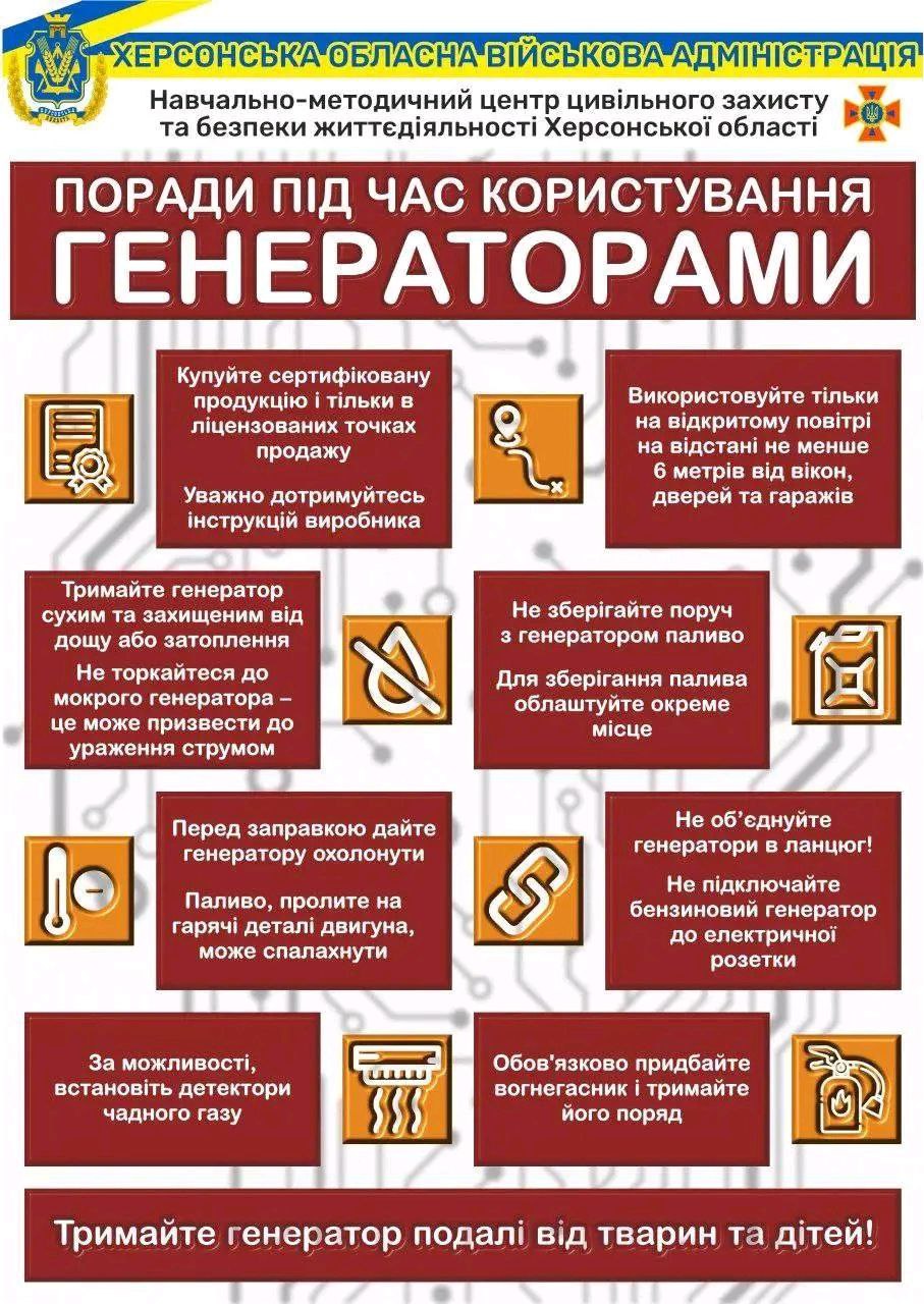 Тому фахівці Навчально-методичний Центр ЦЗ та БЖД Херсонської області підготували поради щодо безпечної експлуатації генераторів.