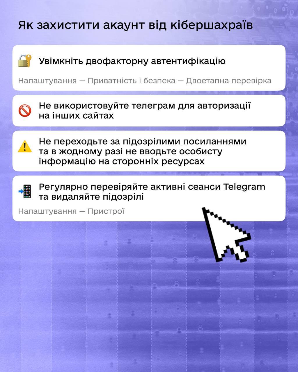 - перевіряйте активні сесії в налаштуваннях Telegram і виходьте з невідомих пристроїв