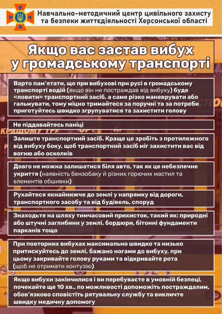 Ця пам’ятка від Навчально-методичного центру ЦЗ та БЖД Херсонської області містить практичні рекомендації, яких варто дотримуватися у випадку вибуху, якщо ви знаходитесь у громадському транспорті.