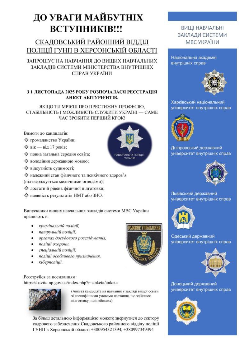 Скадовський районний відділ поліції Головного управління Національної поліції в Херсонській області проводить профорієнтаційний відбір кандидатів для вступу до вищих навчальних закладів!