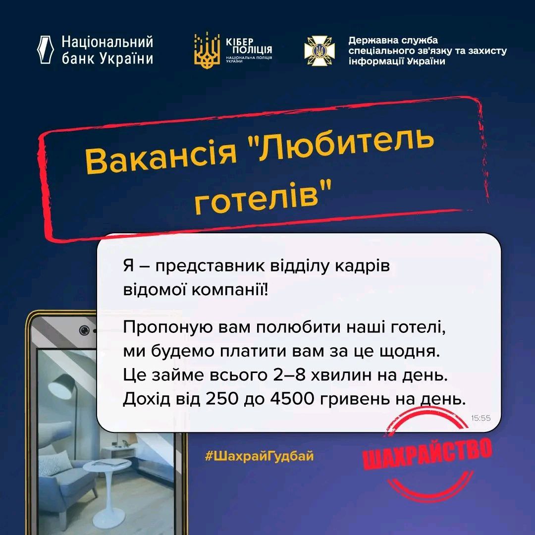 - "Любитель готелів" - люби готелі і отримай гроші, що в перекладі з шахрайської означає, що тобі платитимуть за «лайки» готелям або за позитивні відгуки. Спершу платять невелику суму, але потім виманюють більше грошей з різних приводів.