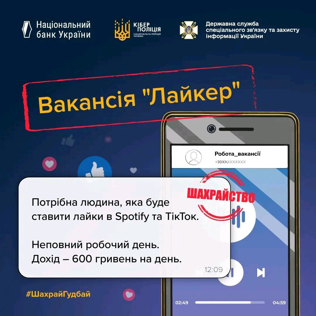 - "Лайкер" - пропонують ставити лайки за гроші, спочатку навіть платять невеликі кошти, а потім переконують заплатити більше.