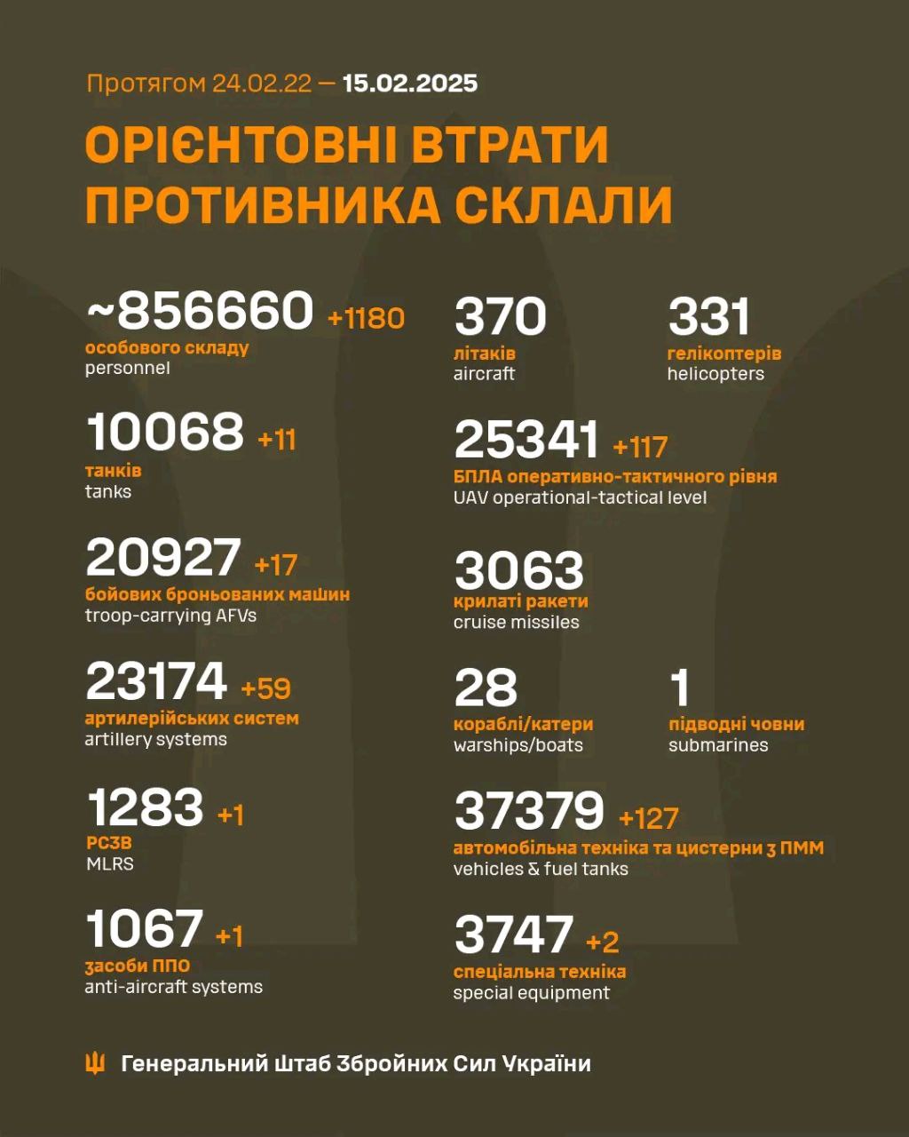 Загальні бойові втрати противника з 24.02.22 по 15.02.25 орієнтовно склали: