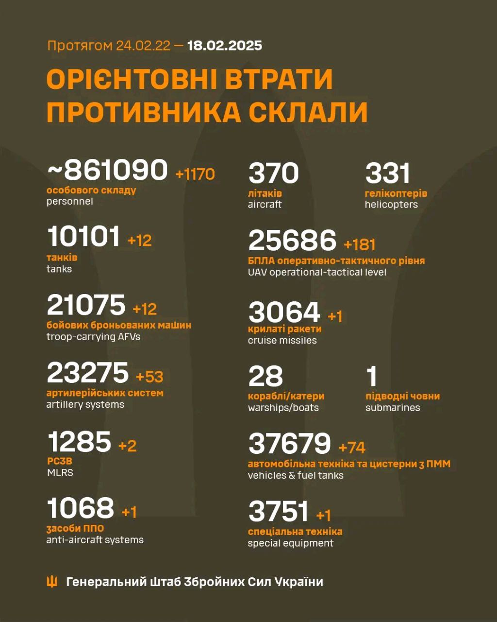 Загальні бойові втрати противника з 24.02.22 по 18.02.25 орієнтовно склали: