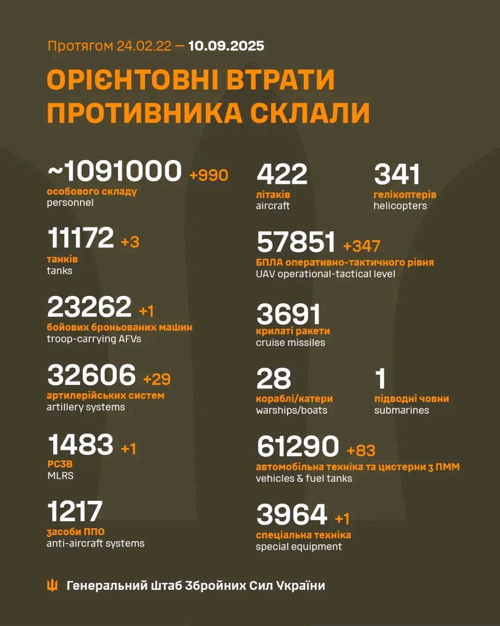 Загальні бойові втрати противника з 24.02.22 по 10.09.25 орієнтовно склали: