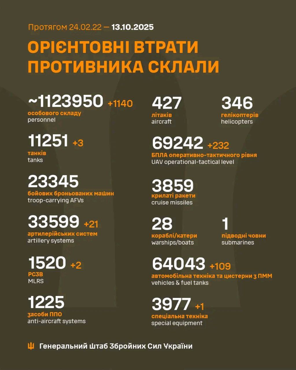 Загальні бойові втрати противника з 24.02.22 по 13.10.25 орієнтовно склали: