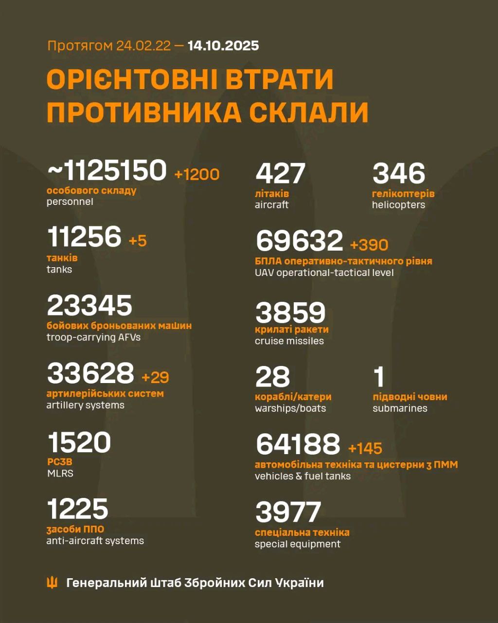 Загальні бойові втрати противника з 24.02.22 по 14.10.25 орієнтовно склали: