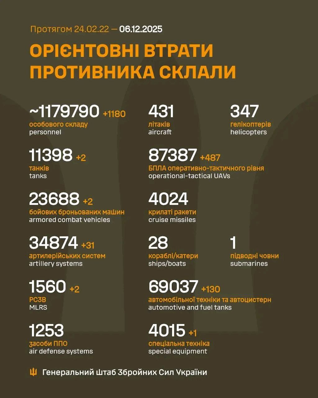 Загальні бойові втрати противника з 24.02.22 по 06.12.25 орієнтовно склали:
