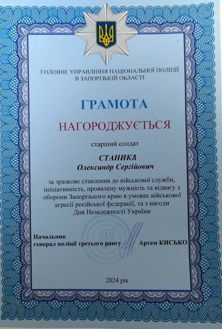 - Грамота від Головного управління Національної поліції в Запорізькій області за зразкове ставлення до служби.