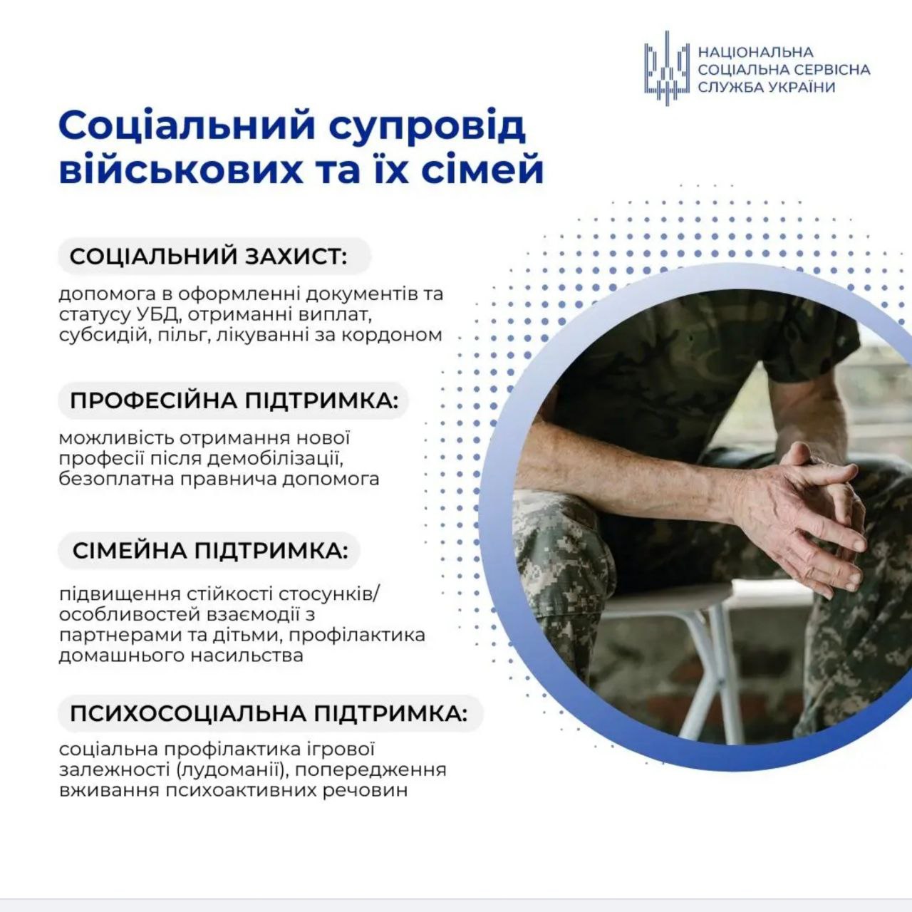 Соціальний супровід спрямований на психосоціальну підтримку захисників та їх родин, а також на запобігання виникненню складних життєвих обставин, зокрема спричинених ігровою залежністю або домашнім насильством.
