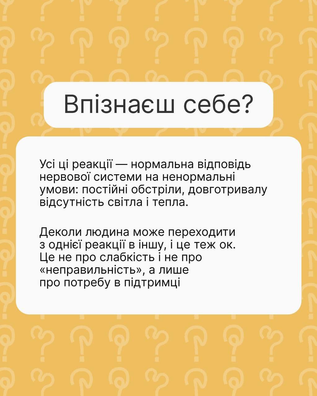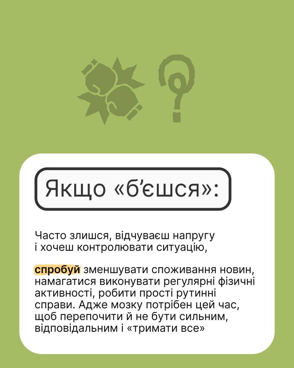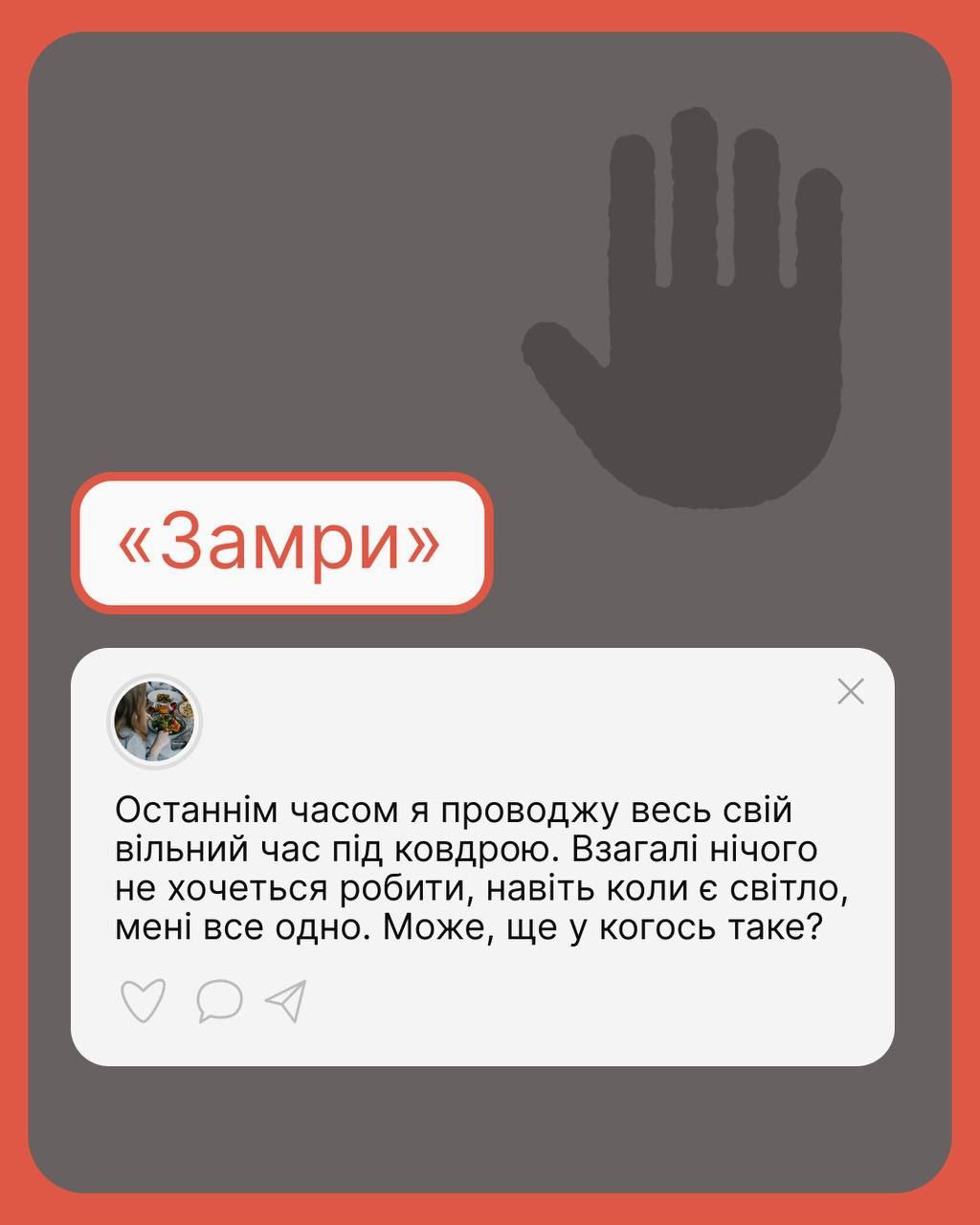 Якщо злишся, тривожишся чи метушишся, або взагалі нічого не робиш — це нормально. Не свари себе за це, а краще постався з розумінням і підтримай.