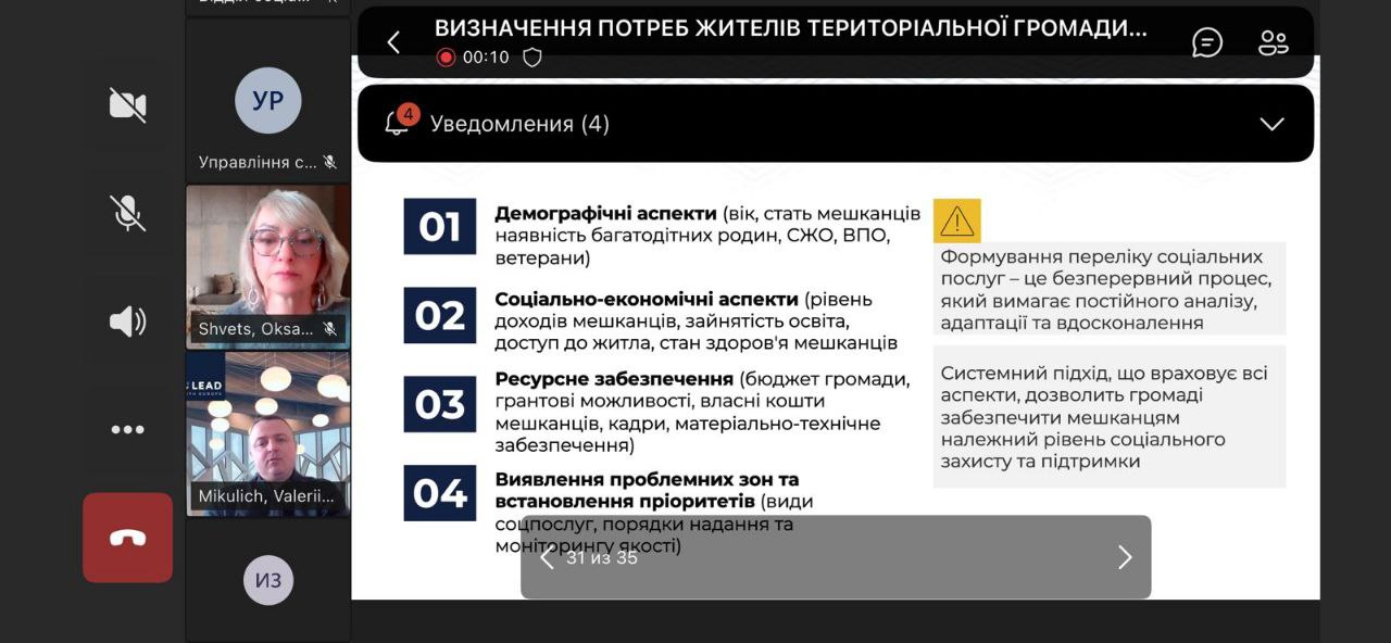 У межах заходу розглянуто підходи та практичні інструменти, які можуть бути використані для проведення оцінки потреб громади у соціальних послугах, зокрема аналіз соціально-демографічних показників, опитування населення, міжвідомчу взаємодію та залучення громадськості.