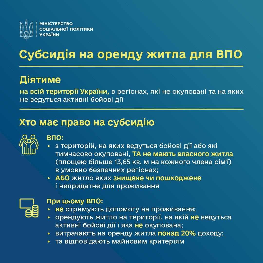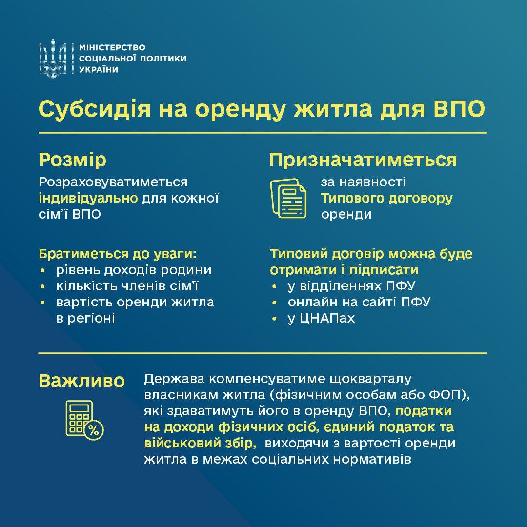 При цьому родина ВПО може одночасно отримувати і субсидію на оренду, і субсидію на житлово-комунальні послуги.