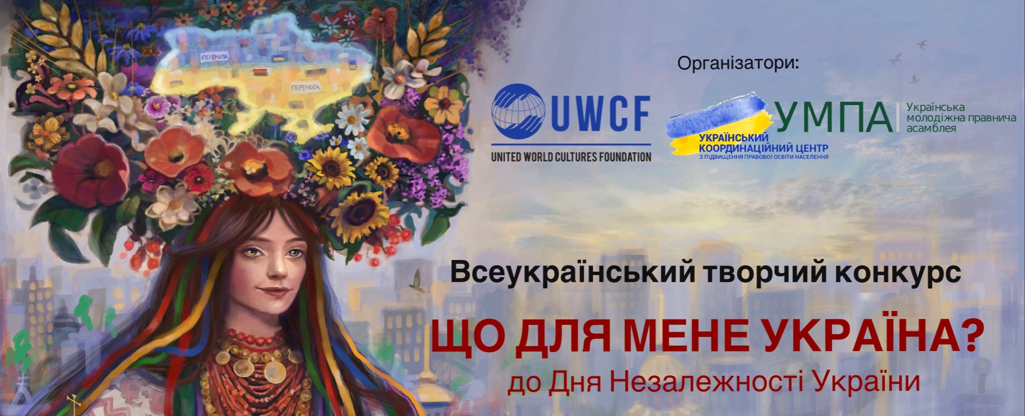 Благодійний фонд «Об’єднання світових культур»/United World Cultures Foundation/UWCF (основний організатор), Український координаційний центр з підвищення правової освіти населення, Українська молодіжна правнича асамблея проводять IV Всеукраїнський творчий конкурс «Що для мене Україна?» (далі – Конк