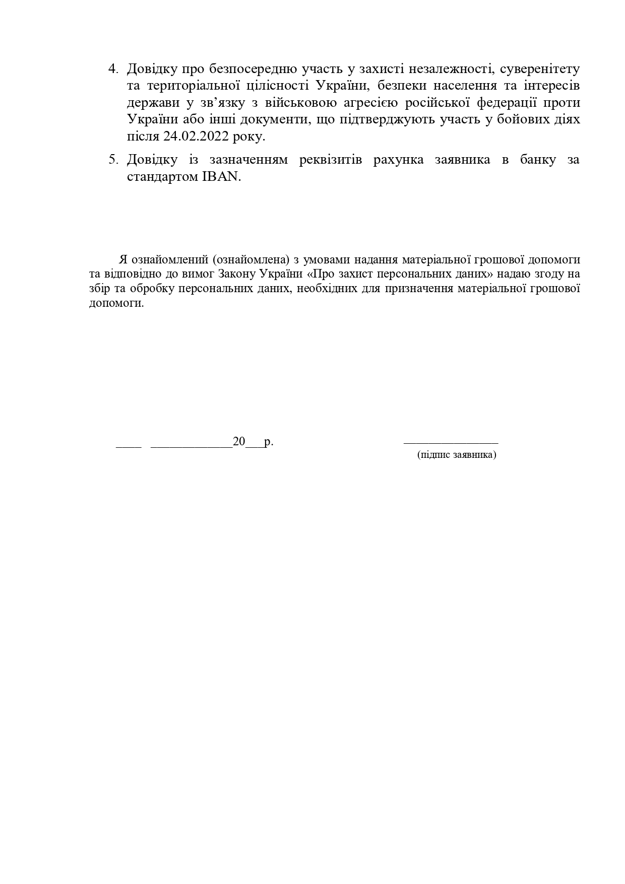 • довідка про безпосередню участь у захисті незалежності, суверенітету та територіальної цілісності України, безпеки населення та інтересів держави у зв’язку з військовою агресією російської федерації проти України або інші документи, що підтверджують участь у бойових діях після 24.02.2022 року;