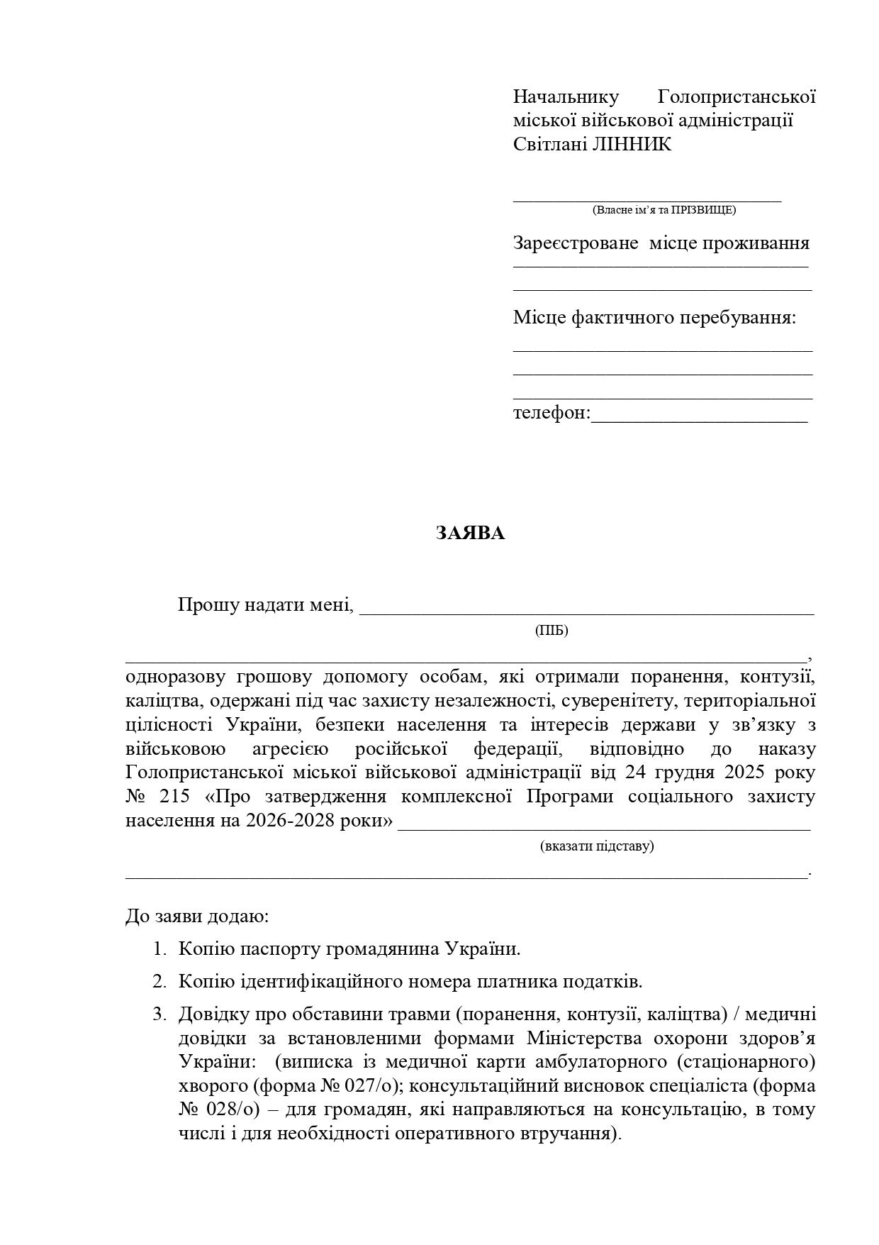 • заява на ім’я керівника УСЗНСП ВК або на ім’я керівника Голопристанської міської військової адміністрації / виконавчого комітету Голопристанської міської ради;
